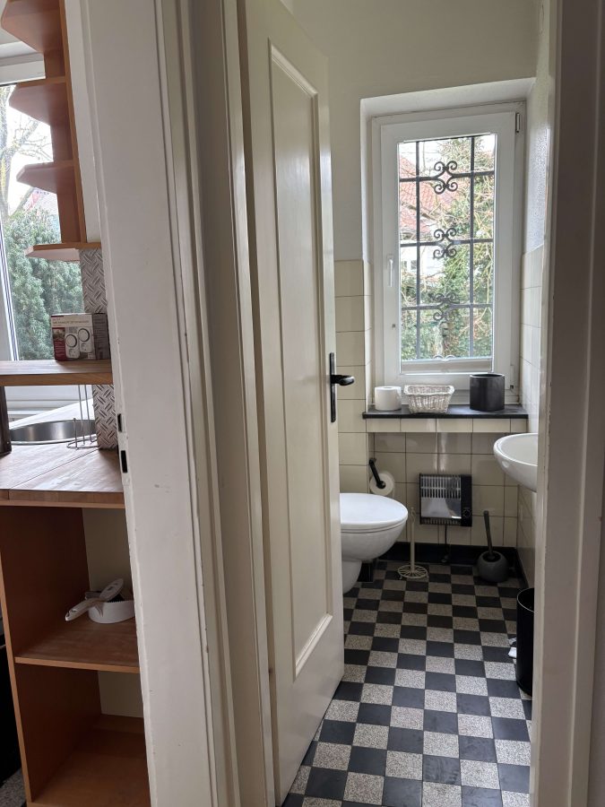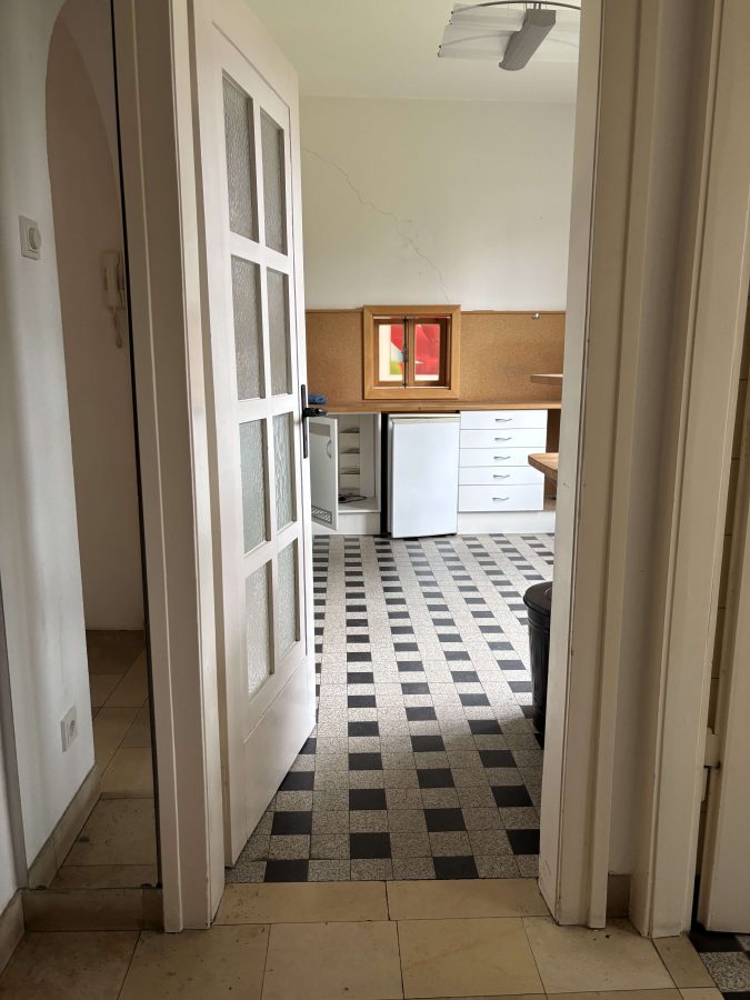 Die Gewerbeeinheit verfügt über zwei großzügige Räume, von denen einer durch eine Schiebetür flexibel in zwei separate Bereiche unterteilt werden kann. Ergänzt wird die Fläche durch einen sehr breiten Flur, der sich ideal als Empfangs- oder Wartebereich eignet, sowie ein separates WC. In der Küche sind eine Arbeitsfläche, eine Spüle und ein Kühlschrank vorhanden, die bei Bedarf kostenlos übernommen werden können; außerdem ist ein großes, fest installiertes Wandregal vorhanden. Große Fenster sorgen für viel Tageslicht, zusätzlich gibt es einen direkten Ausgang in den Garten. Im Keller steht weitere Abstellfläche zur Verfügung. Der Zugang zur Einheit erfolgt über eine kleine Treppe. Zwei Stellplätze gehören zur Einheit.