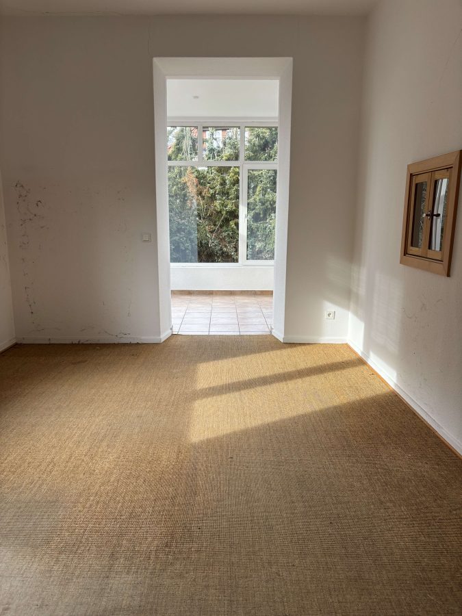 Die Fläche verfügt über einen funktionalen Grundriss mit Flur, zwei großzügigen Räumen, Küche sowie separatem WC. Ein Raum kann bei Bedarf durch eine Schiebetür in zwei Bereiche geteilt werden, wodurch flexible Nutzungsmöglichkeiten entstehen. Zwei Stellplätze gehören zur Einheit und runden das Angebot ab.