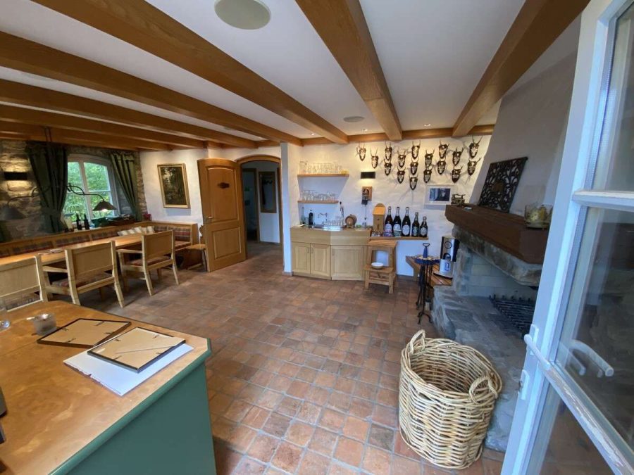 Erdgeschoss: Diele, kleine Küche mit Kühlkammer, Gäste-WC, einem ca. 30 m² großen Essraum mit offenen Kamin und Ausgang auf die Terrasse