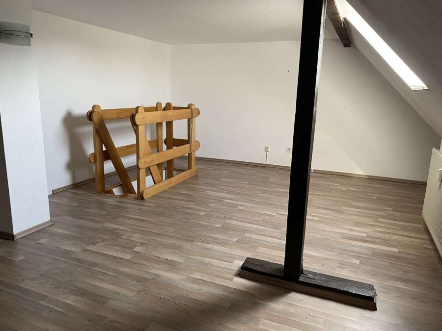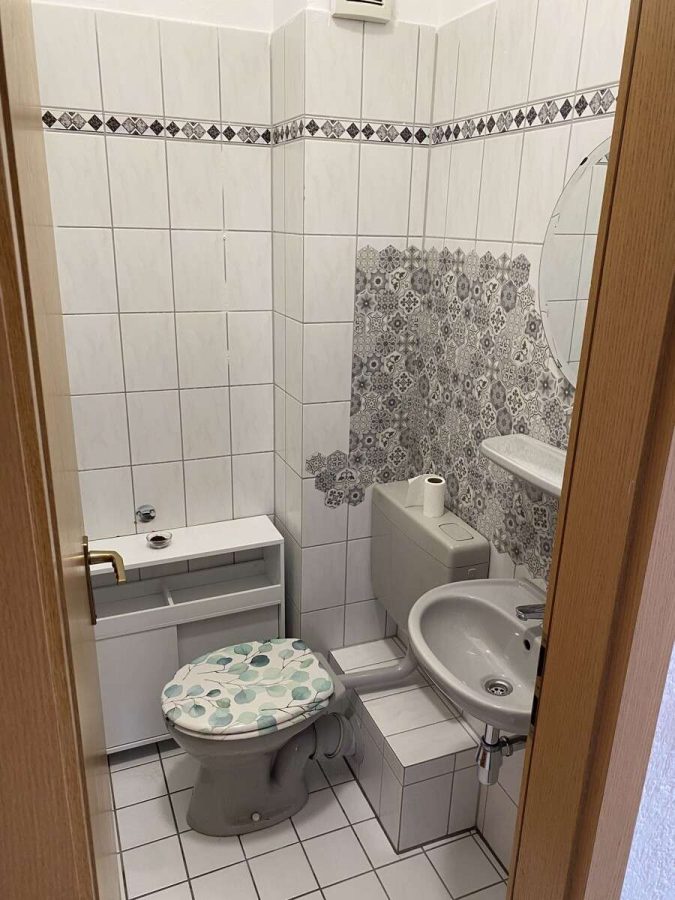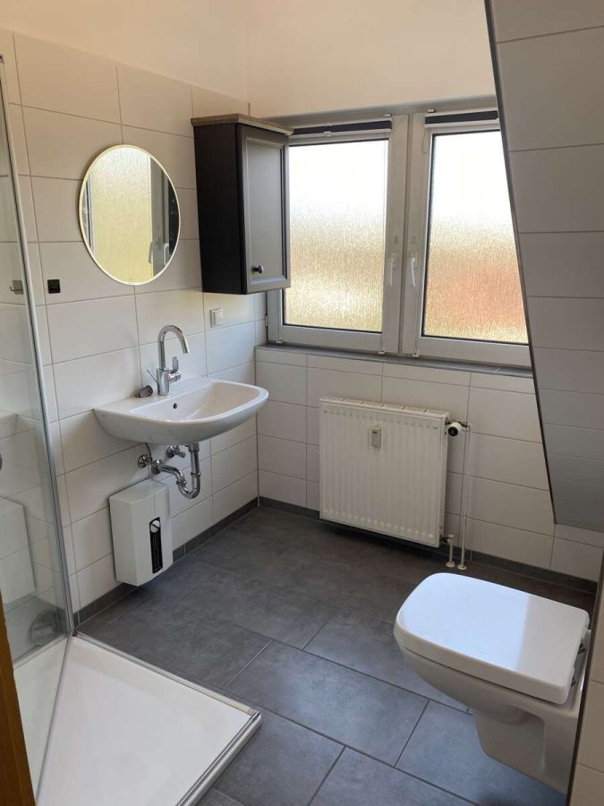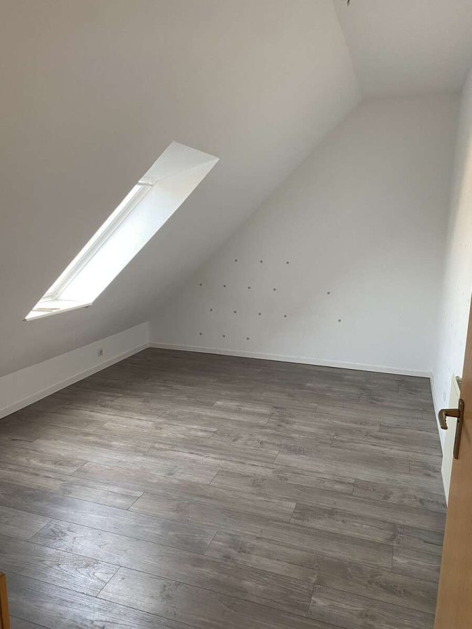 Die Wohnfläche verteilt sich auf eine Diele, ein großzügiges Wohnzimmer, ein Schlafzimmer, ein Kinderzimmer, eine Küche inklusive Einbauküche, ein modernisiertes Badezimmer sowie ein separates Gäste-WC. Das Badezimmer präsentiert sich in einem zeitgemäßen und ansprechenden Stil mit modernen Fliesen und Glasduschwänden. Ergänzt wird das Raumangebot durch eine praktische Abstellkammer sowie den Aufgang in den Spitzboden, der zusätzliche Nutzfläche bietet.