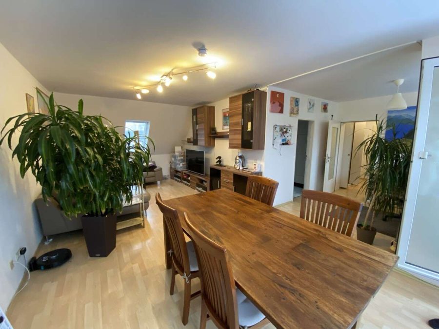 Das ca. 33m² großzügige Wohnzimmer bietet jede Menge Platz für Ihre Couch, einen Esstisch sowie eine Arbeitsecke. Von hier aus gelangen Sie auch auf Ihre neue Dachterrasse.